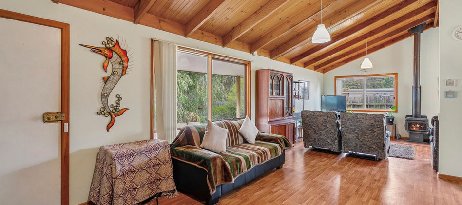 As you enter the house the high timbered ceilings and the living areas that flow through to the glass sliding doors create an enjoyable country spacious ambience whilst a large wood heater keeps the house warm and delivers more charm.
